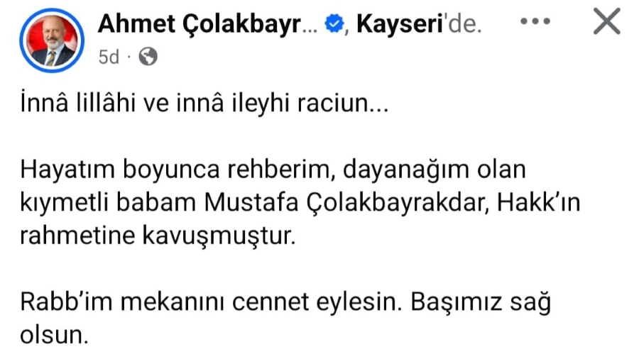 Kocasinan Belediye Başkanı Ahmet Çolakbayrakdar'ın babası Mustafa Çolakbayrakdar geçirdiği rahatsızlık sonucu hayatını kaybetti.