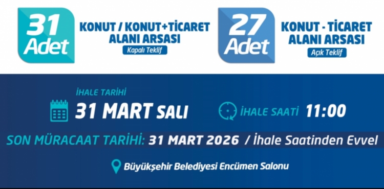31 Mart 2026 Salı günü Büyükşehir Belediyesi Encümen Salonu'nda, 31 adet arsa ile diğer 27 adet arsanın satış ihalesi saat 11.00'de gerçekleşecek.