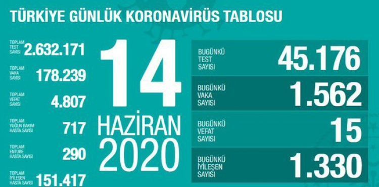 Türkiye Günlük Koronavirüs Tablosu'nu göre; son 24 saatte 45 bin 176 test yapıldı, 1562 kişiye daha koronavirüs teşhisi konuldu. Virüs nedeniyle 15 kişi yaşamını yitirirken, 1330 kişi de iyileşti. Bügünkü verilerle, toplam test sayısı 2 milyon 632 bin 171, toplam vaka sayısı 178 bin 239, toplam vefat sayısı 4 bin 807, toplam yoğun bakım hasta sayısı 717, solunum cihazına bağlı toplam hasta sayısı 290, toplam iyileşen hasta sayısı 151 bin 417 oldu.