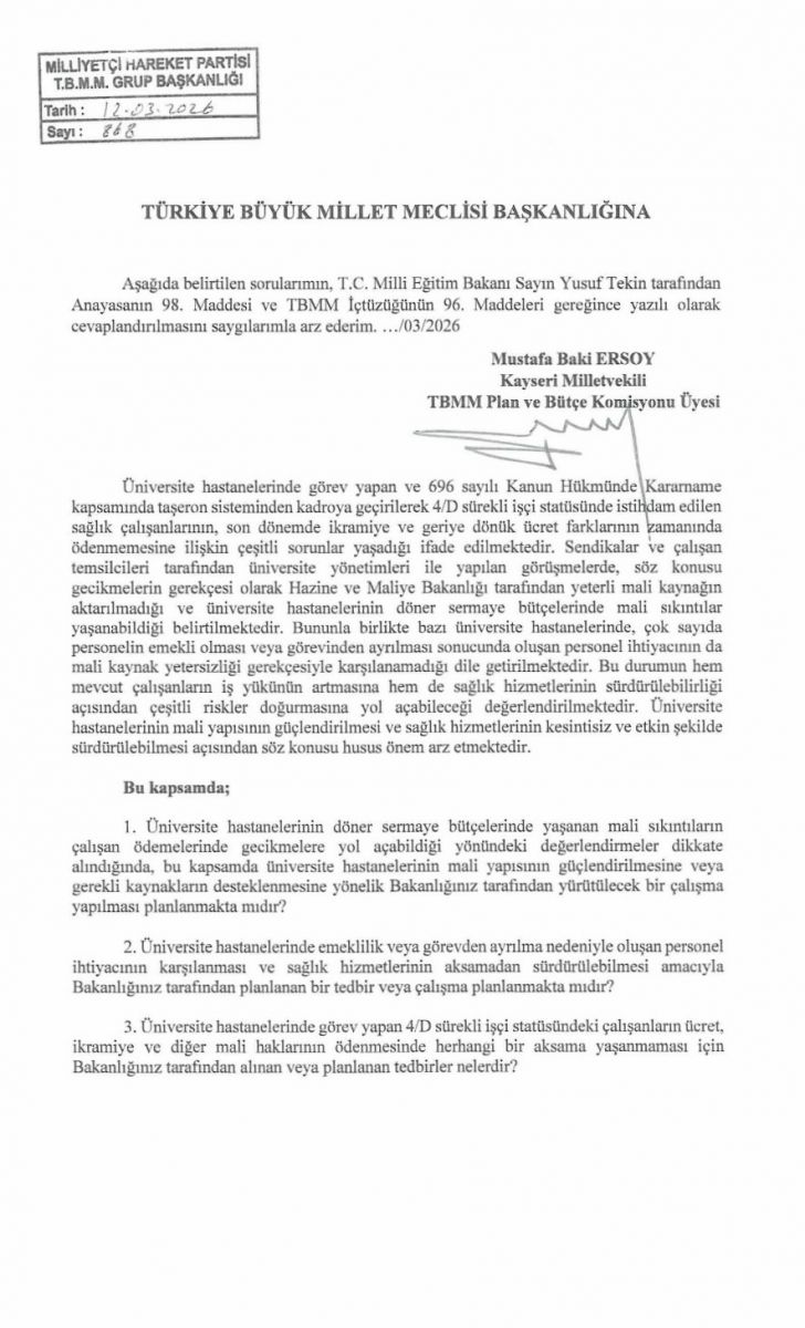 MHP Kayseri Milletvekili Baki Ersoy, üniversite hastanelerinde görev yapan 4/D statüsündeki sağlık çalışanlarının ikramiye ve mali haklarında yaşanan gecikmeler ile personel eksikliğini TBMM gündemine taşıdı.