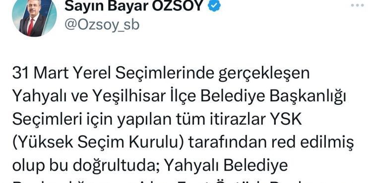 31 Mart Mahalli İdareler Seçimleri’nde Yahyalı’da Yeniden Refah Partisi’nin, Yeşilhisar’da ise İYİ Parti’nin İlçe Seçim Kurulları’na yapmış olduğu son itirazlar da Yüksek Seçim Kurulu’nca reddedildi.